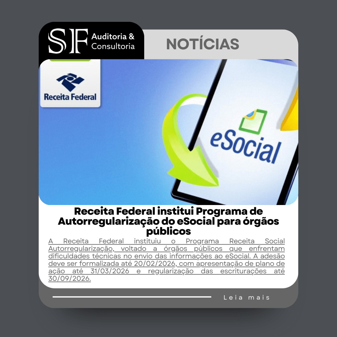 A Receita Federal do Brasil instituiu, por meio da Portaria RFB nº 632, de 30 de dezembro de 2025, o Programa Receita Social Autorregularização, destinado a órgãos públicos da União, dos Estados e dos Municípios que enfrentam dificuldades técnicas no cumprimento da escrituração do eSocial.