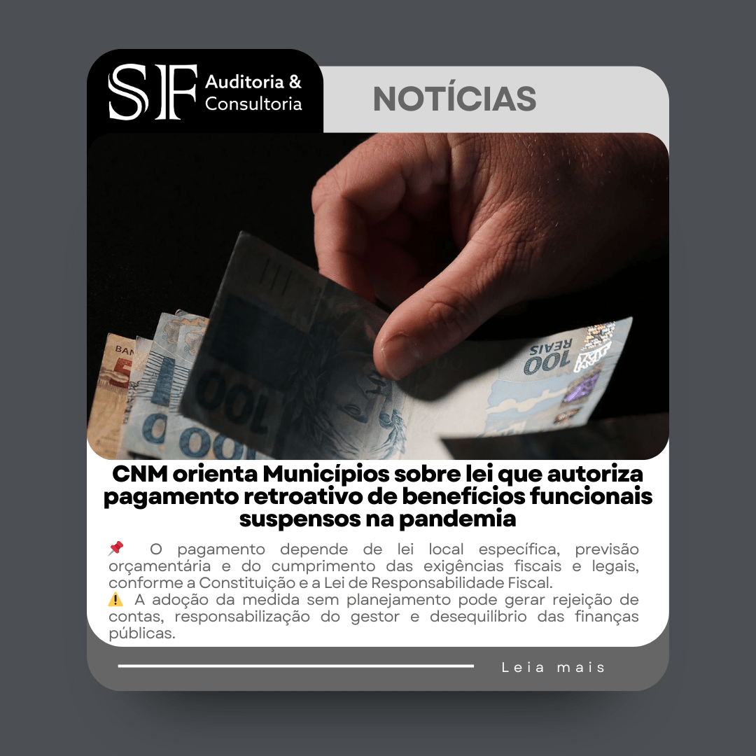 A norma permite o pagamento de vantagens como anuênios, triênios, quinquênios, licença-prêmio e sexta-parte, referentes ao período de 28 de maio de 2020 a 31 de dezembro de 2021, intervalo em que a Lei Complementar nº 173/2020 suspendeu a contagem do tempo de serviço e o pagamento desses benefícios. Contudo, a CNM ressalta que o pagamento não é obrigatório.