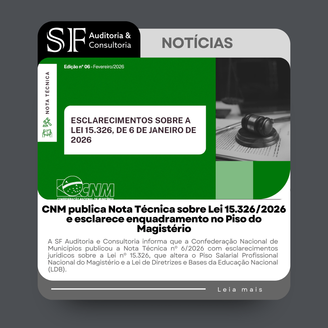 A SF Auditoria e Consultoria informa que a Confederação Nacional de Municípios publicou a Nota Técnica nº 6/2026 com esclarecimentos jurídicos sobre a Lei nº 15.326, que altera o Piso Salarial Profissional Nacional do Magistério e a Lei de Diretrizes e Bases da Educação Nacional (LDB).