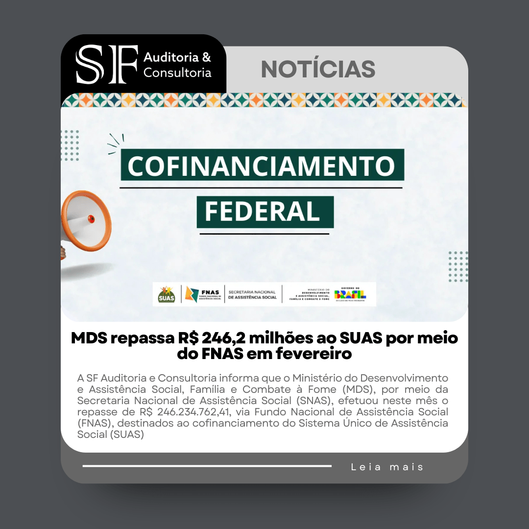 A SF Auditoria e Consultoria informa que o Ministério do Desenvolvimento e Assistência Social, Família e Combate à Fome (MDS), por meio da Secretaria Nacional de Assistência Social (SNAS), efetuou neste mês o repasse de R$ 246.234.762,41, via Fundo Nacional de Assistência Social (FNAS), destinados ao cofinanciamento do Sistema Único de Assistência Social (SUAS).