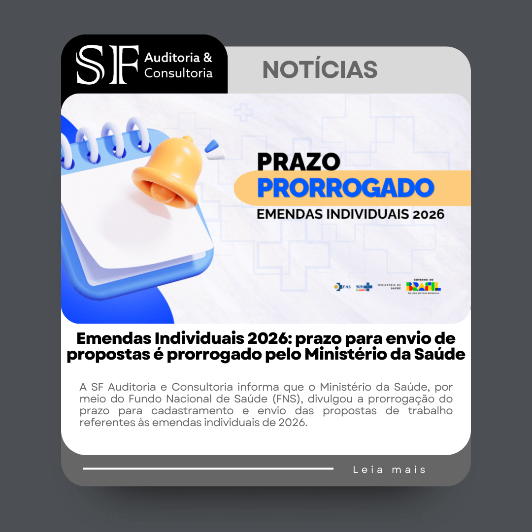 A SF Auditoria e Consultoria informa que o Ministério da Saúde, por meio do Fundo Nacional de Saúde (FNS), divulgou a prorrogação do prazo para cadastramento e envio das propostas de trabalho referentes às emendas individuais de 2026.