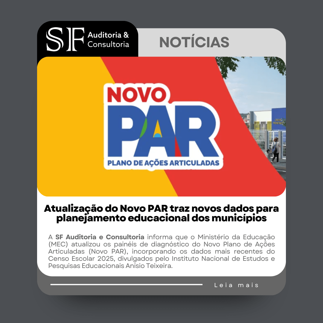 A SF Auditoria e Consultoria informa que o Ministério da Educação (MEC) atualizou os painéis de diagnóstico do Novo Plano de Ações Articuladas (Novo PAR), incorporando os dados mais recentes do Censo Escolar 2025, divulgados pelo Instituto Nacional de Estudos e Pesquisas Educacionais Anísio Teixeira.
