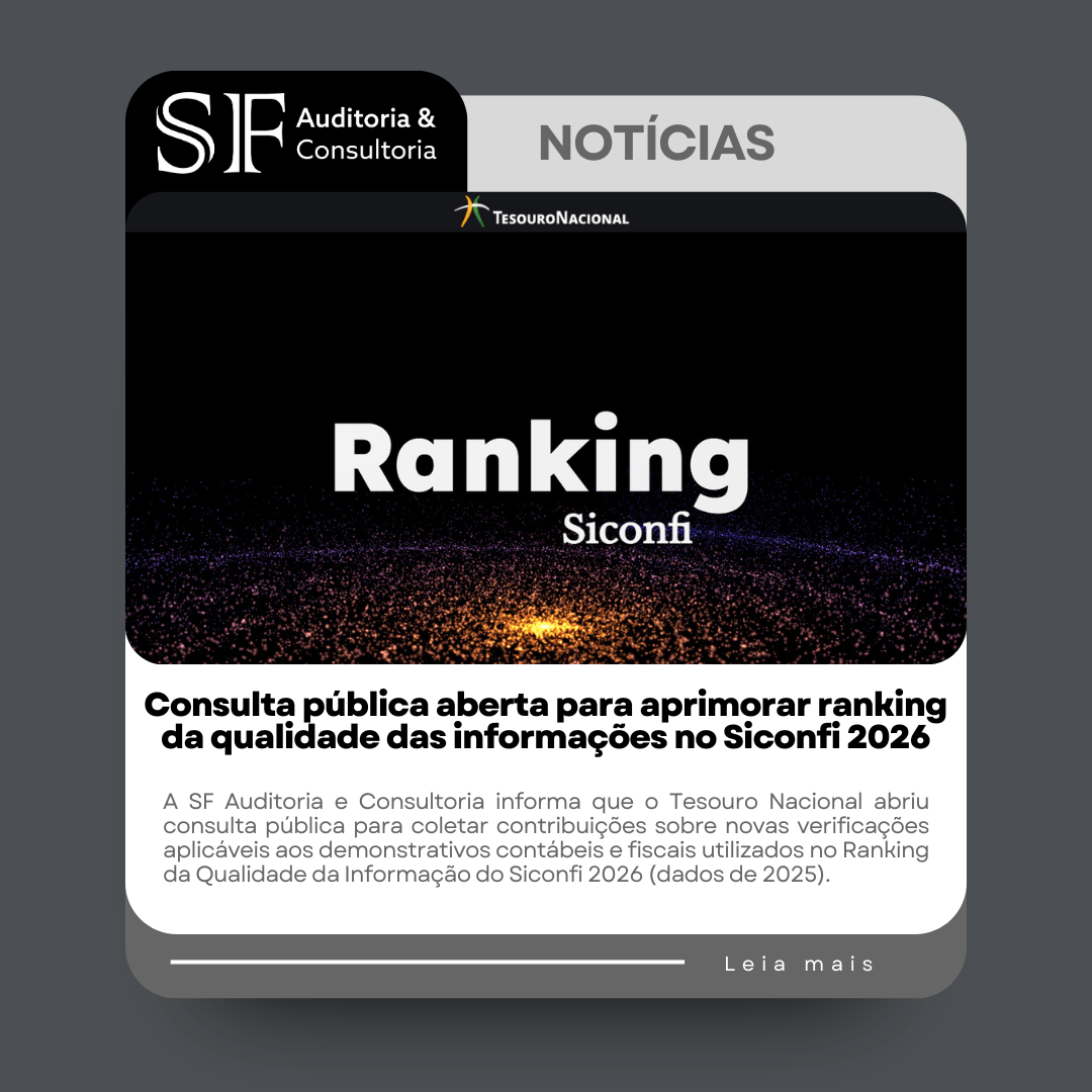 A SF Auditoria e Consultoria informa que o Tesouro Nacional abriu consulta pública para coletar contribuições sobre novas verificações aplicáveis aos demonstrativos contábeis e fiscais utilizados no Ranking da Qualidade da Informação do Siconfi 2026 (dados de 2025).