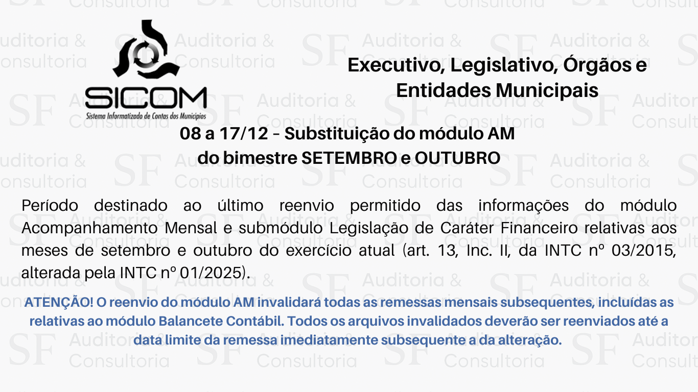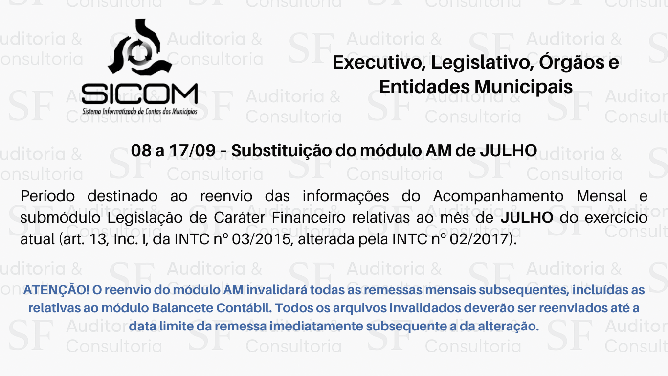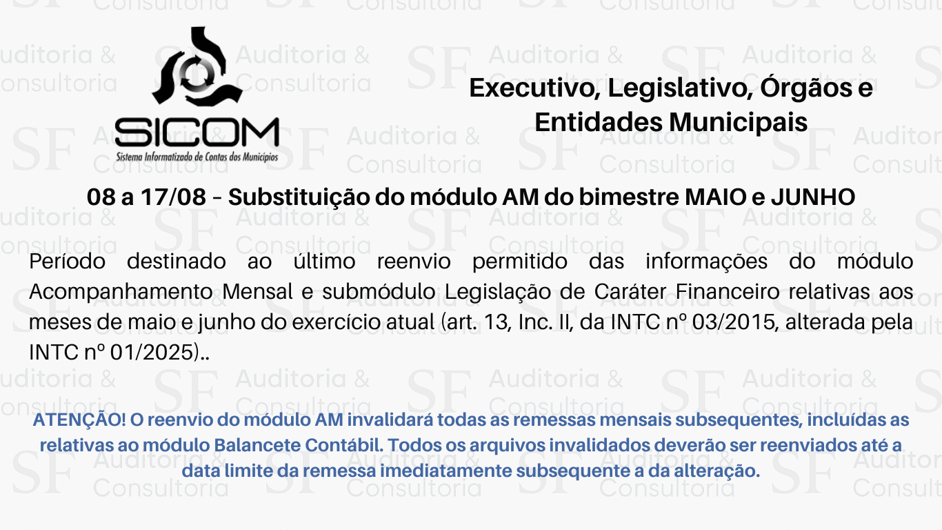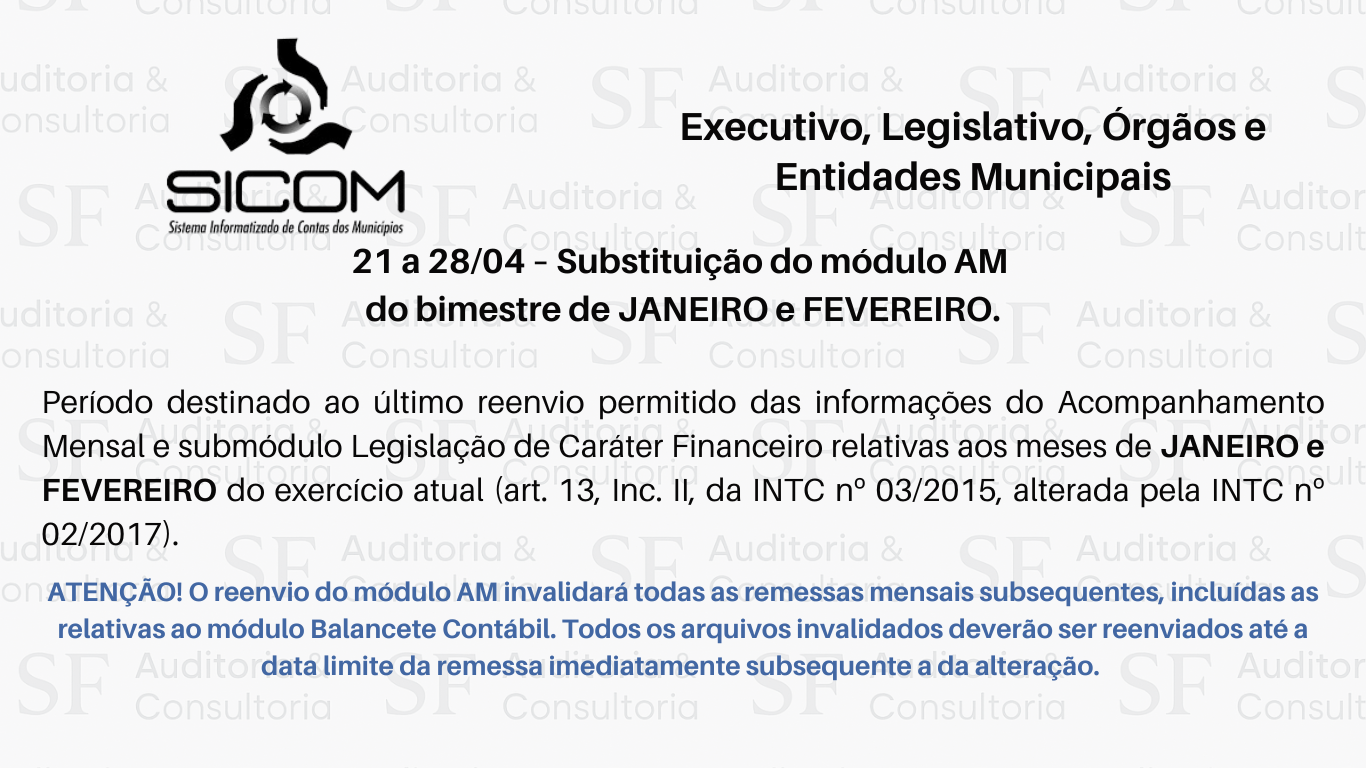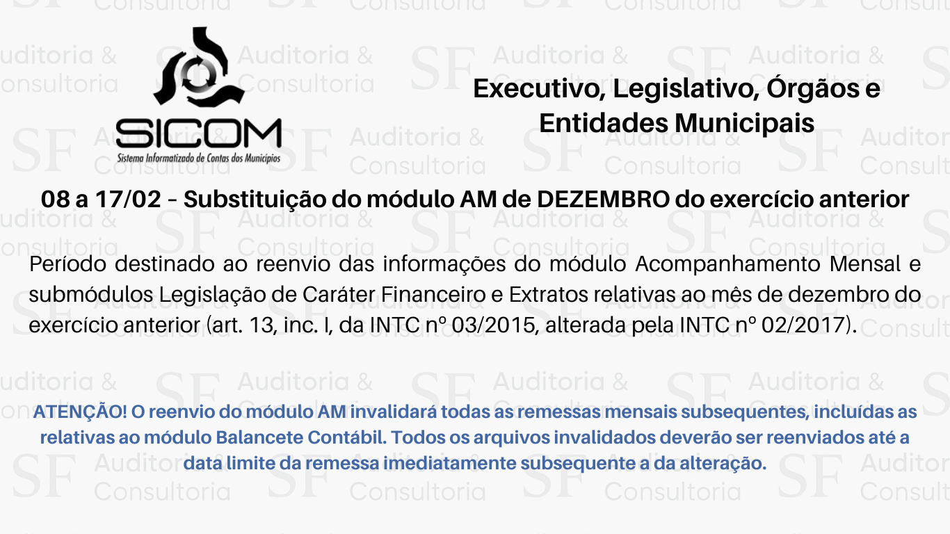 Caso o reenvio de informações ao Sicom (substituição de remessas AM e Balancete) não seja realizado por completo no prazo estabelecido pelo Tribunal, elas não serão reconhecidas e serão expurgadas do banco de dados do Tribunal, permanecendo válidas e reconhecidas pelo Sicom as remessas enviadas anteriormente (Art. 14-A, parágrafo único da INTC nº 03/2015, alterada pela INTC nº 02/2017).