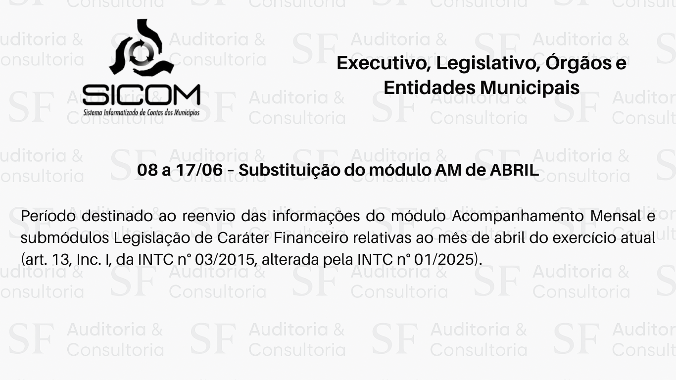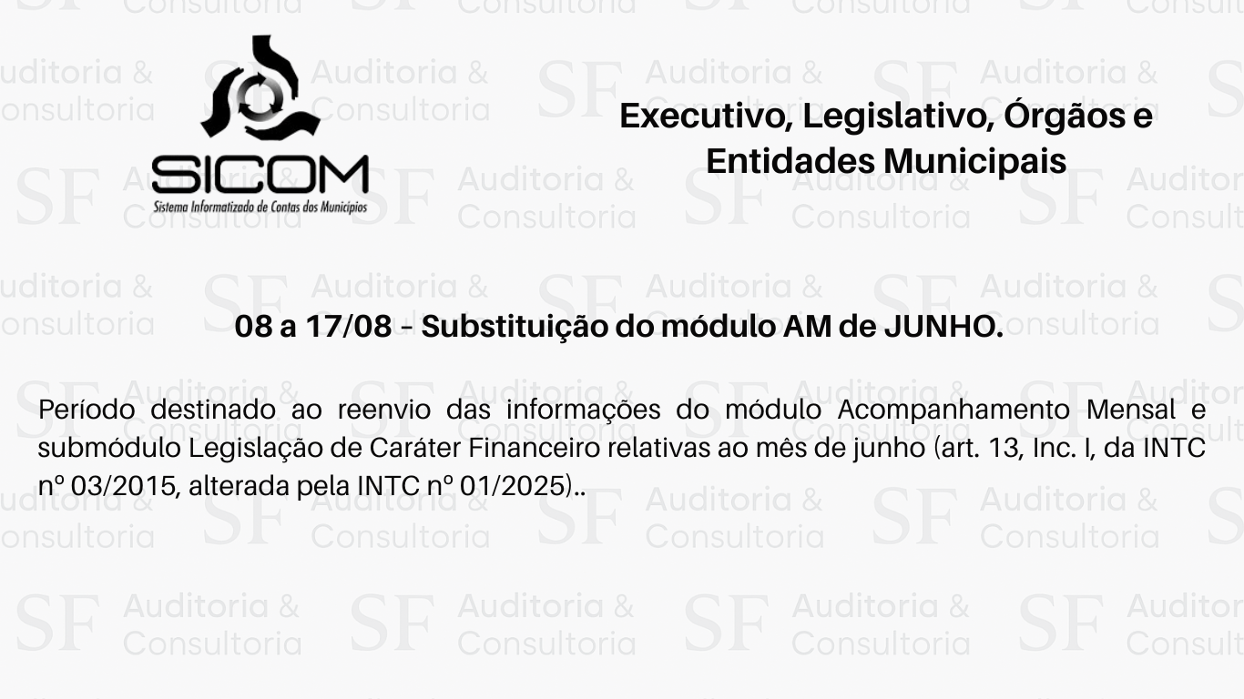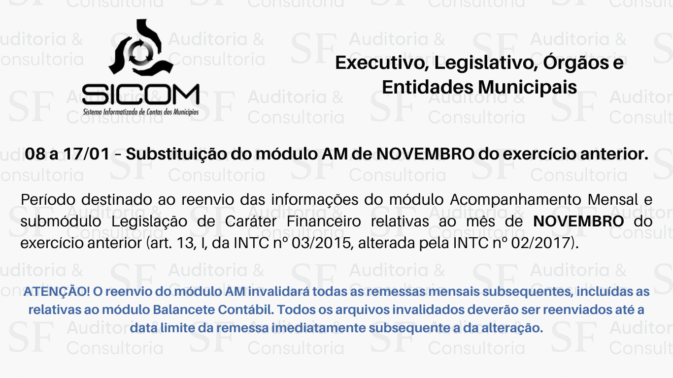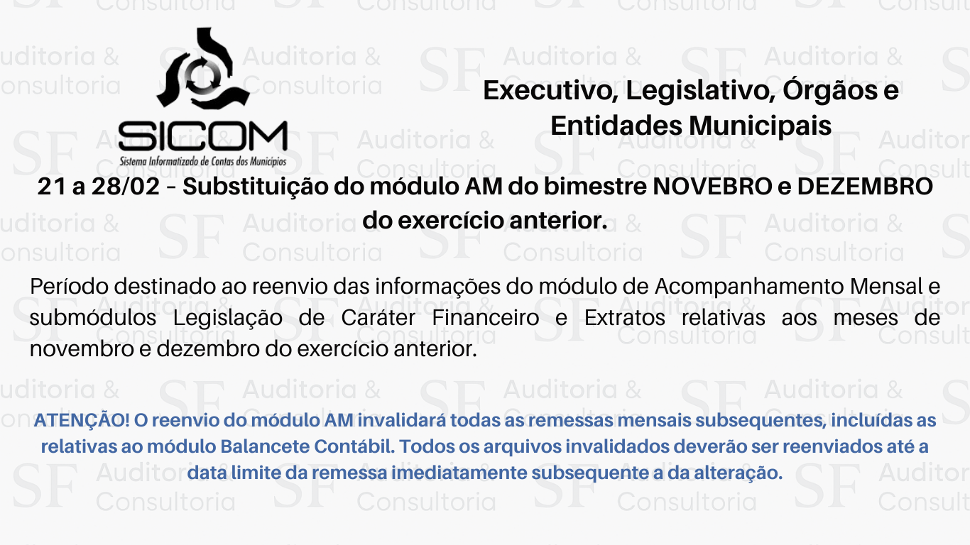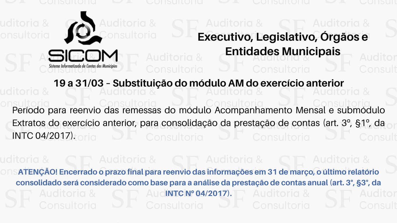 Caso o reenvio de informações ao Sicom (substituição de remessas AM e Balancete) não seja realizado por completo no prazo estabelecido pelo Tribunal, elas não serão reconhecidas e serão expurgadas do banco de dados do Tribunal, permanecendo válidas e reconhecidas pelo Sicom as remessas enviadas anteriormente (Art. 14-A, parágrafo único da INTC nº 03/2015, alterada pela INTC nº 02/2017).