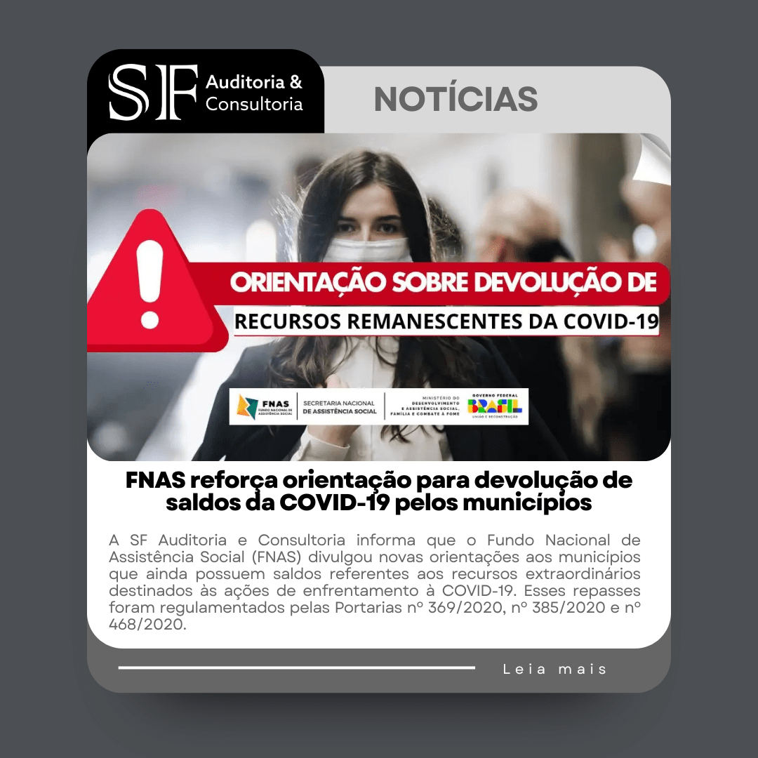 A SF Auditoria e Consultoria informa que o Fundo Nacional de Assistência Social (FNAS) divulgou novas orientações aos municípios que ainda possuem saldos referentes aos recursos extraordinários destinados às ações de enfrentamento à COVID-19. Esses repasses foram regulamentados pelas Portarias nº 369/2020, nº 385/2020 e nº 468/2020. De acordo com o FNAS, é obrigatório queContinuarContinuar lendo “FNAS reforça orientação para devolução de saldos da COVID-19 pelos municípios”