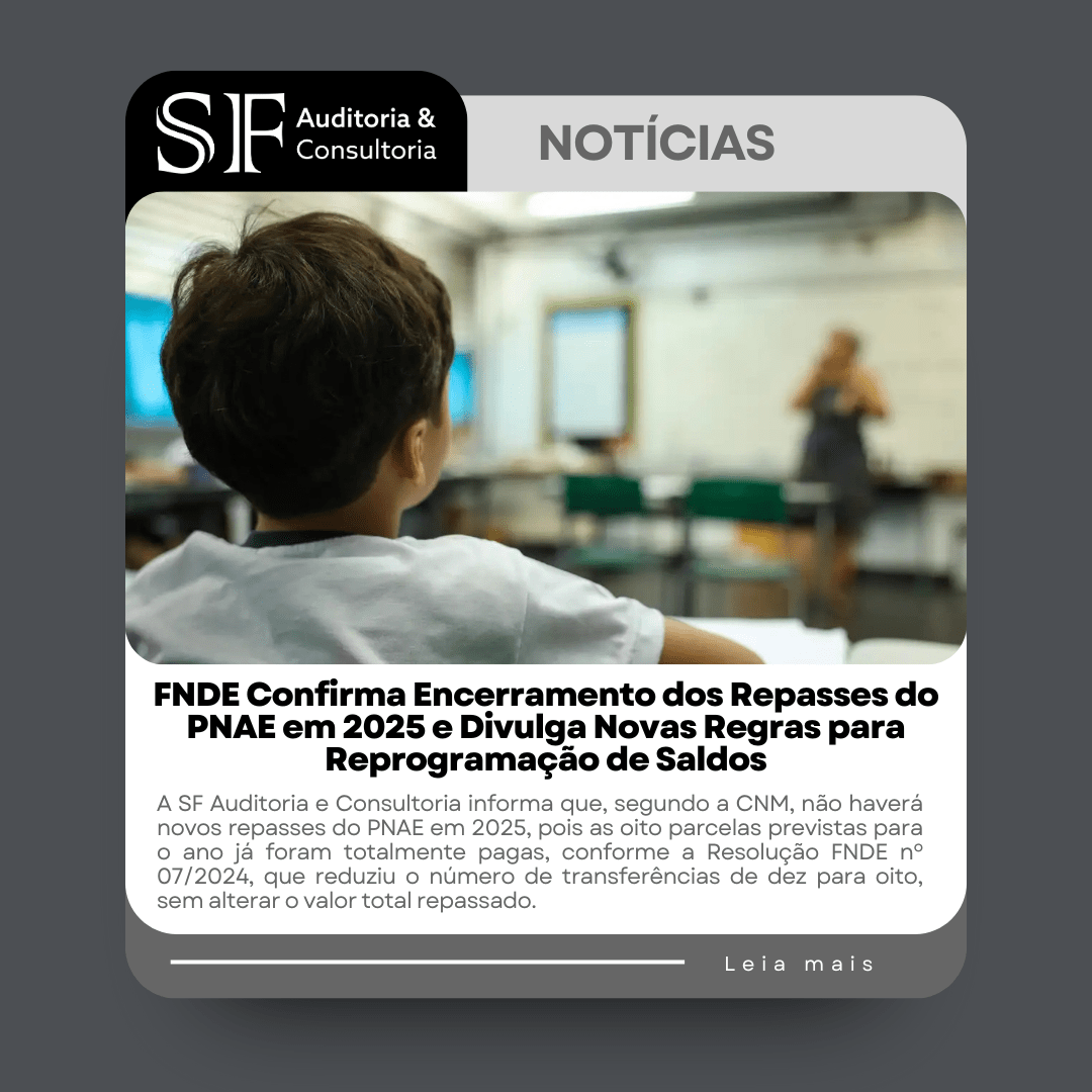 A SF Auditoria e Consultoria informa que, conforme dados divulgados pela Confederação Nacional de Municípios (CNM), não haverá novos repasses do Programa Nacional de Alimentação Escolar (PNAE) em 2025. Isso porque todas as oito parcelas previstas para o exercício foram integralmente pagas, conforme estabelecido pela Resolução FNDE nº 07/2024, que reduziu o número de transferênciasContinuarContinuar lendo “FNDE Confirma Encerramento dos Repasses do PNAE em 2025 e Divulga Novas Regras para Reprogramação de Saldos”