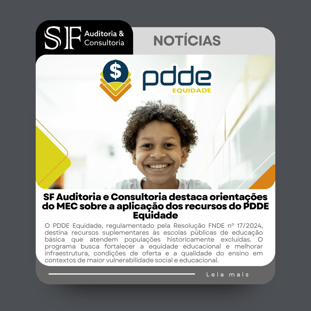 A SF Auditoria e Consultoria informa que o Ministério da Educação (MEC) realizará, na próxima terça-feira, 18 de novembro, uma transmissão ao vivo destinada a orientar gestoras e gestores escolares sobre o uso dos recursos do Programa Dinheiro Direto na Escola (PDDE) Equidade – Educação para as Relações Étnico-Raciais e Educação Escolar Quilombola (ERER/EEQ). AContinuarContinuar lendo “SF Auditoria e Consultoria destaca orientações do MEC sobre a aplicação dos recursos do PDDE Equidade”
