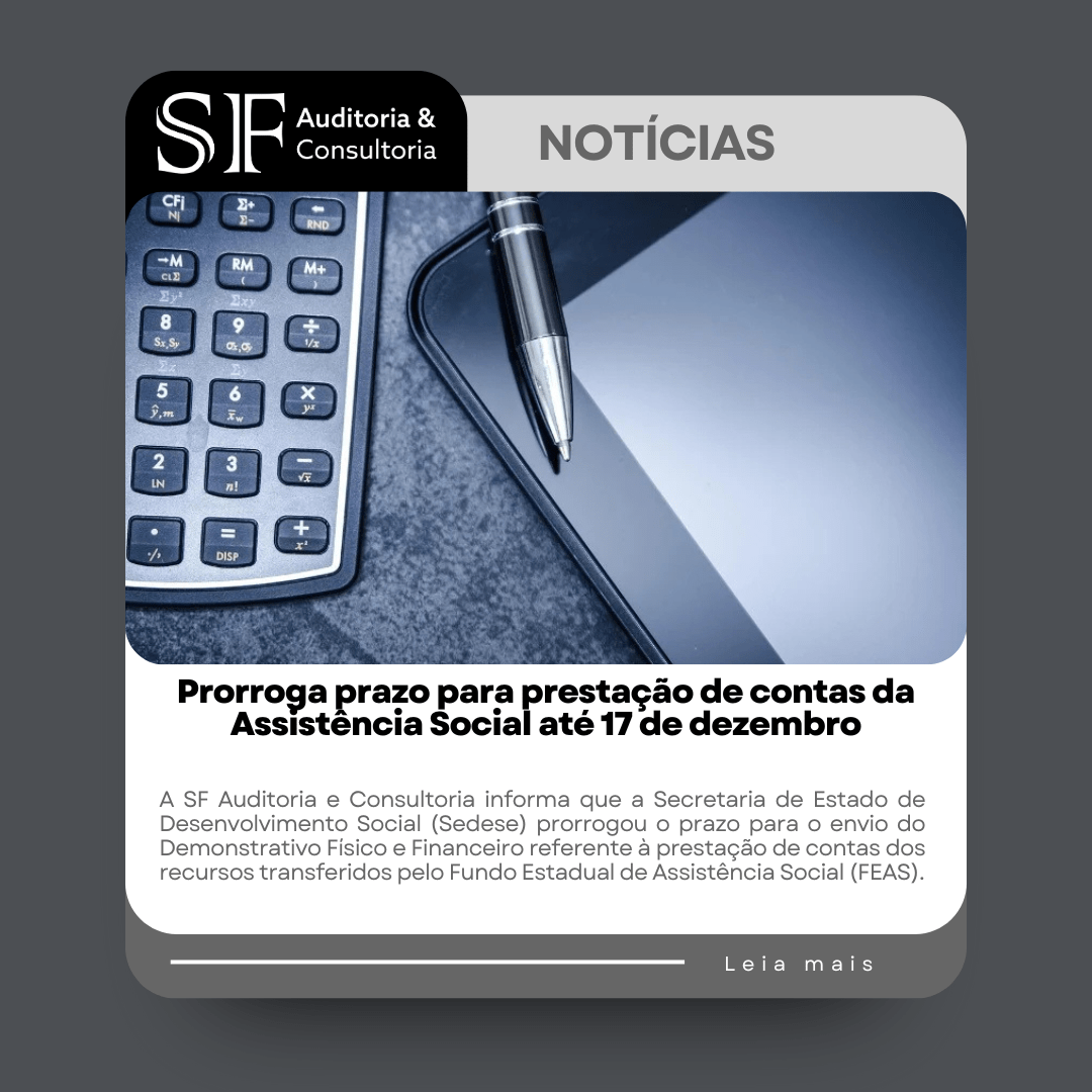 A SF Auditoria e Consultoria informa que a Secretaria de Estado de Desenvolvimento Social (Sedese) prorrogou o prazo para o envio do Demonstrativo Físico e Financeiro referente à prestação de contas dos recursos transferidos pelo Fundo Estadual de Assistência Social (FEAS). Os municípios mineiros terão até o dia 17 de dezembro de 2025 para concluirContinuarContinuar lendo “Prorroga prazo para prestação de contas da Assistência Social até 17 de dezembro”