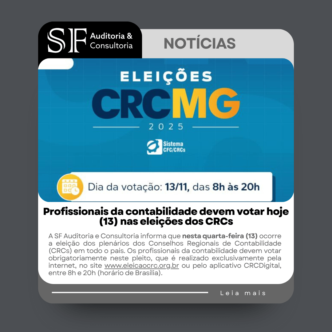 A SF Auditoria e Consultoria informa que nesta quarta-feira (13) ocorre a eleição dos plenários dos Conselhos Regionais de Contabilidade (CRCs) em todo o país. Os profissionais da contabilidade devem votar obrigatoriamente neste pleito, que é realizado exclusivamente pela internet, no site http://www.eleicaocrc.org.br ou pelo aplicativo CRCDigital, entre 8h e 20h (horário de Brasília). AContinuarContinuar lendo “Profissionais da contabilidade devem votar hoje (13) nas eleições dos CRCs”