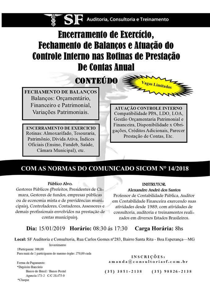 Venha participar! Solicite sua inscrição através de uma das formas de contato: e-mail: amanda@consultoriasf.com.br (35) 98826-2138 (WhatsApp) (35) 98896-1070 (35) 3851-2138