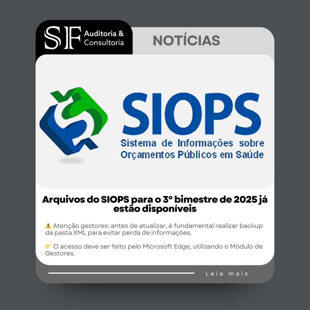 A SF Auditoria e Consultoria informa que o Ministério da Saúde, por meio do Departamento de Economia e Desenvolvimento em Saúde (DESID), disponibilizou os arquivos de estrutura para preenchimento e transmissão dos dados referentes ao 3º bimestre de 2025. O material pode ser baixado no site do SIOPS, na página do Módulo de Gestores, sendoContinuarContinuar lendo “Arquivos do SIOPS para o 3º bimestre de 2025 já estão disponíveis”