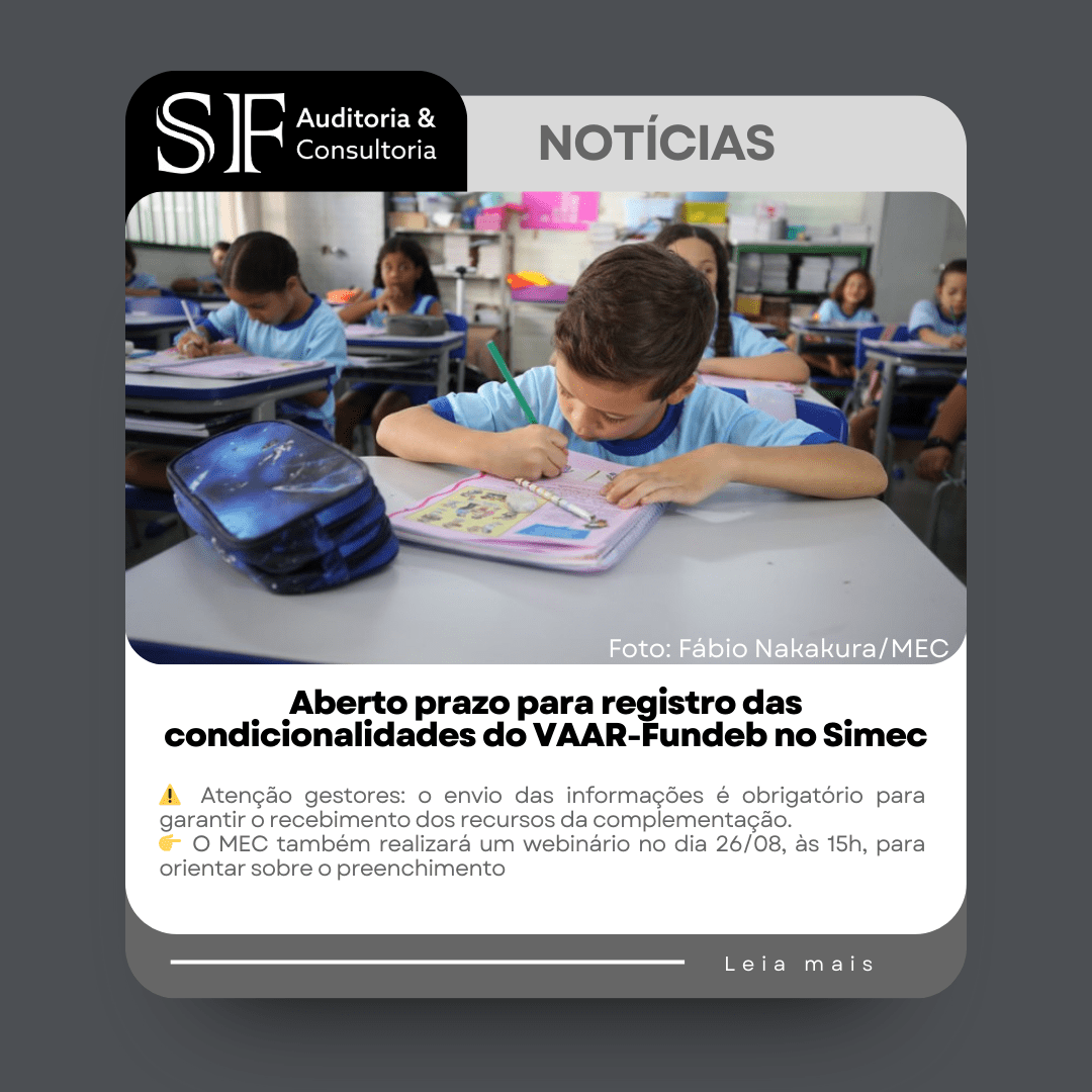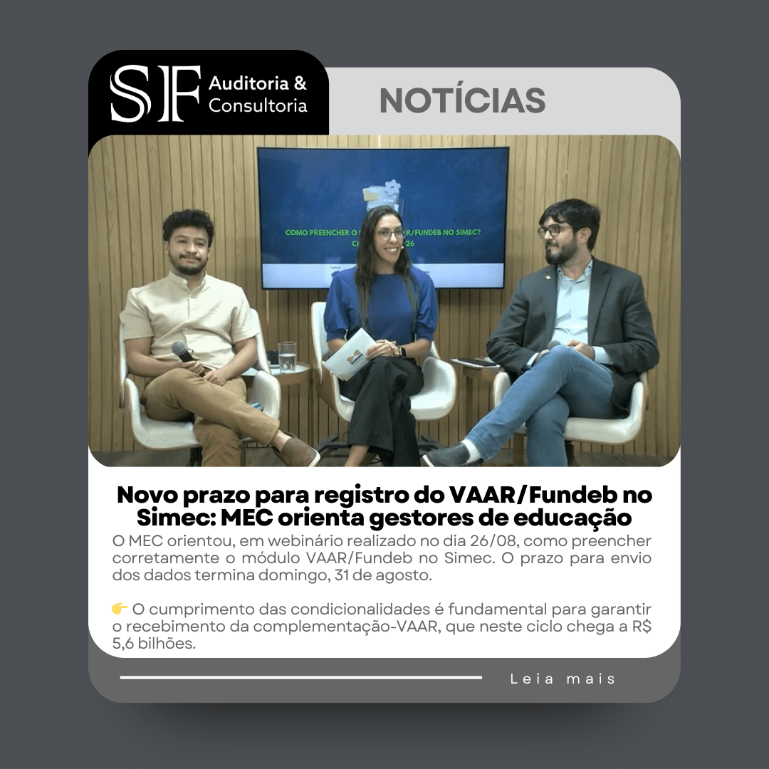 A SF Auditoria e Consultoria destaca que o Ministério da Educação (MEC) realizou, em 26 de agosto, um webinário para orientar equipes técnicas e secretários de educação sobre o correto preenchimento do módulo VAAR/Fundeb no Sistema Integrado de Monitoramento, Execução e Controle (Simec). O objetivo foi detalhar o processo de comprovação das condicionalidades necessárias paraContinuarContinuar lendo “Novo prazo para registro do VAAR/Fundeb no Simec: MEC orienta gestores de educação”