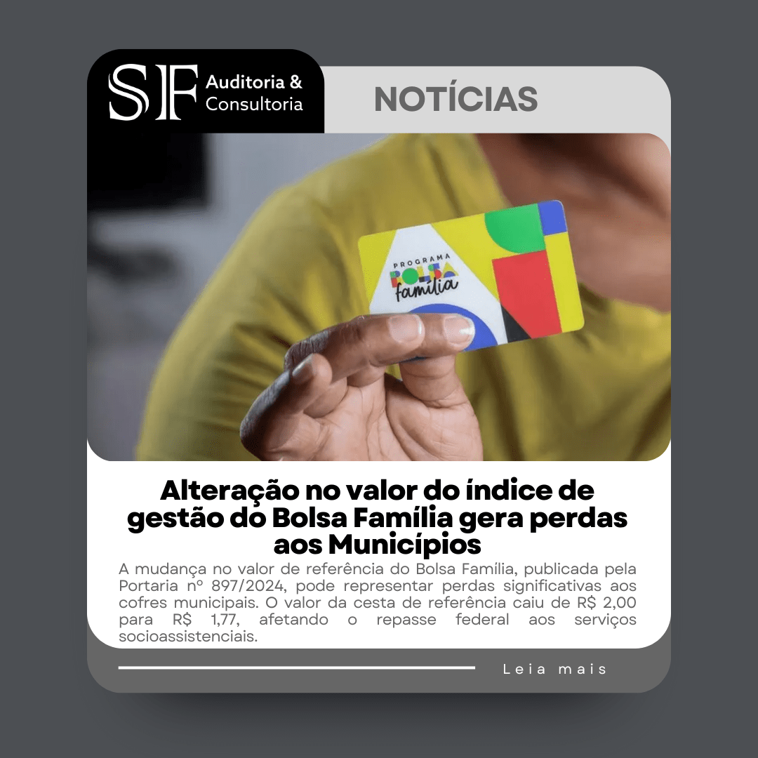 A SF Auditoria e Consultoria destaca que a recente mudança no valor de referência do Programa Bolsa Família pode trazer prejuízos financeiros significativos aos municípios brasileiros. Segundo análise da Confederação Nacional de Municípios (CNM), a alteração foi publicada por meio da Portaria nº 897/2024 do Ministério do Desenvolvimento e Assistência Social, Família e Combate àContinuarContinuar lendo “Alteração no valor do índice de gestão do Bolsa Família gera perdas aos Municípios”