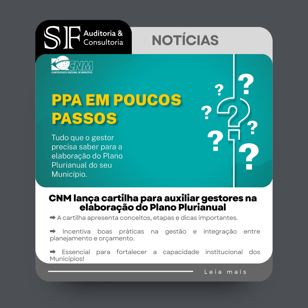 A Confederação Nacional de Municípios (CNM) disponibilizou em sua Biblioteca Virtual a cartilha “PPA em poucos passos”, elaborada pela área de Contabilidade Municipal da entidade. O material tem como objetivo auxiliar os gestores municipais na construção do Plano Plurianual (PPA) de forma prática, simples e eficiente. A CNM reforça a importância de que os MunicípiosContinuarContinuar lendo “CNM lança cartilha para auxiliar gestores na elaboração do Plano Plurianual”