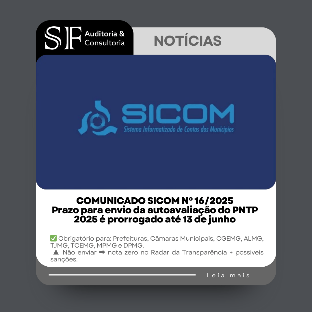O Tribunal de Contas do Estado de Minas Gerais (TCEMG), por meio do Comunicado SICOM nº 16/2025, informou a prorrogação, em caráter improrrogável, até o dia 13 de junho de 2025, do prazo para envio da autoavaliação no Levantamento Nacional de Transparência Pública (PNTP 2025). Esta é uma oportunidade fundamental para que todas as unidadesContinuarContinuar lendo “Prazo para envio da autoavaliação do PNTP 2025 é prorrogado até 13 de junho”