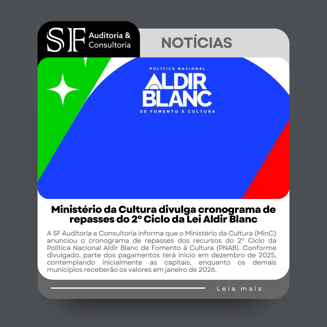 A SF Auditoria e Consultoria informa que o Ministério da Cultura (MinC) anunciou o cronograma de repasses dos recursos do 2º Ciclo da Política Nacional Aldir Blanc de Fomento à Cultura (PNAB). Conforme divulgado, parte dos pagamentos terá início em dezembro de 2025, contemplando inicialmente as capitais, enquanto os demais municípios receberão os valores emContinuarContinuar lendo “Ministério da Cultura divulga cronograma de repasses do 2º Ciclo da Lei Aldir Blanc”