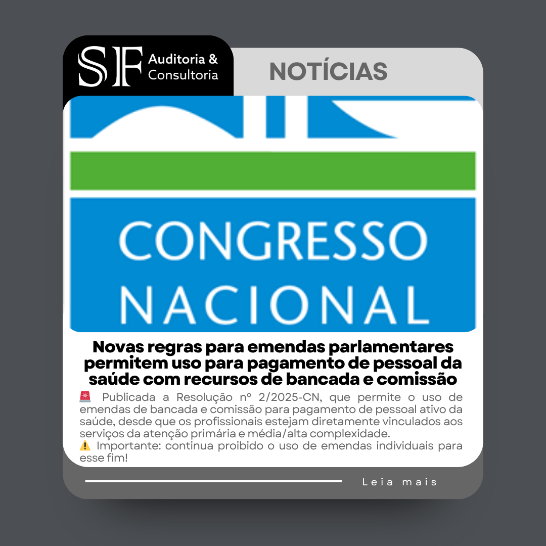 Foi publicada no Diário Oficial da União de 24/06/2025 a Resolução nº 2/2025-CN, aprovada pelo Congresso Nacional, que altera dispositivos da Resolução nº 1/2006-CN com foco no aprimoramento do rito de apresentação, indicação e execução de emendas parlamentares às leis orçamentárias. Dentre as alterações, destaca-se a possibilidade de utilização dos recursos de emendas de comissãoContinuarContinuar lendo “Novas regras para emendas parlamentares permitem uso para pagamento de pessoal da saúde com recursos de bancada e comissão”